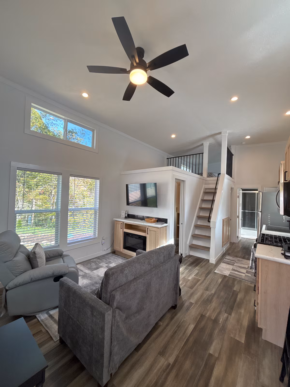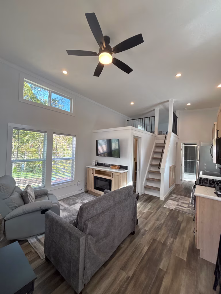 Step inside to a bright, open living area with vaulted ceilings, large windows, and plenty of natural light. The cozy sitting area features a smart TV and an electric fireplace, perfect for relaxing evenings after a day of exploring.