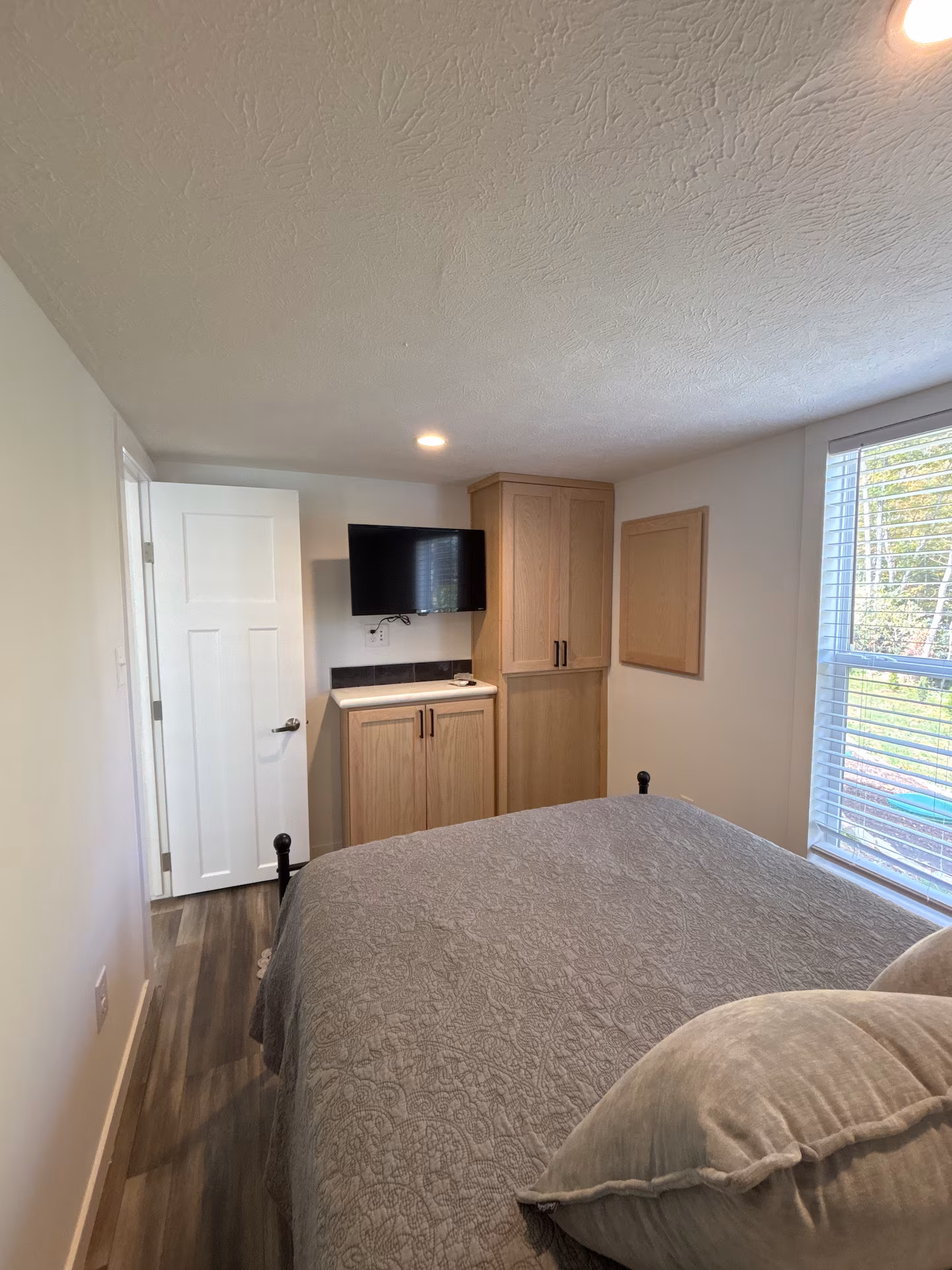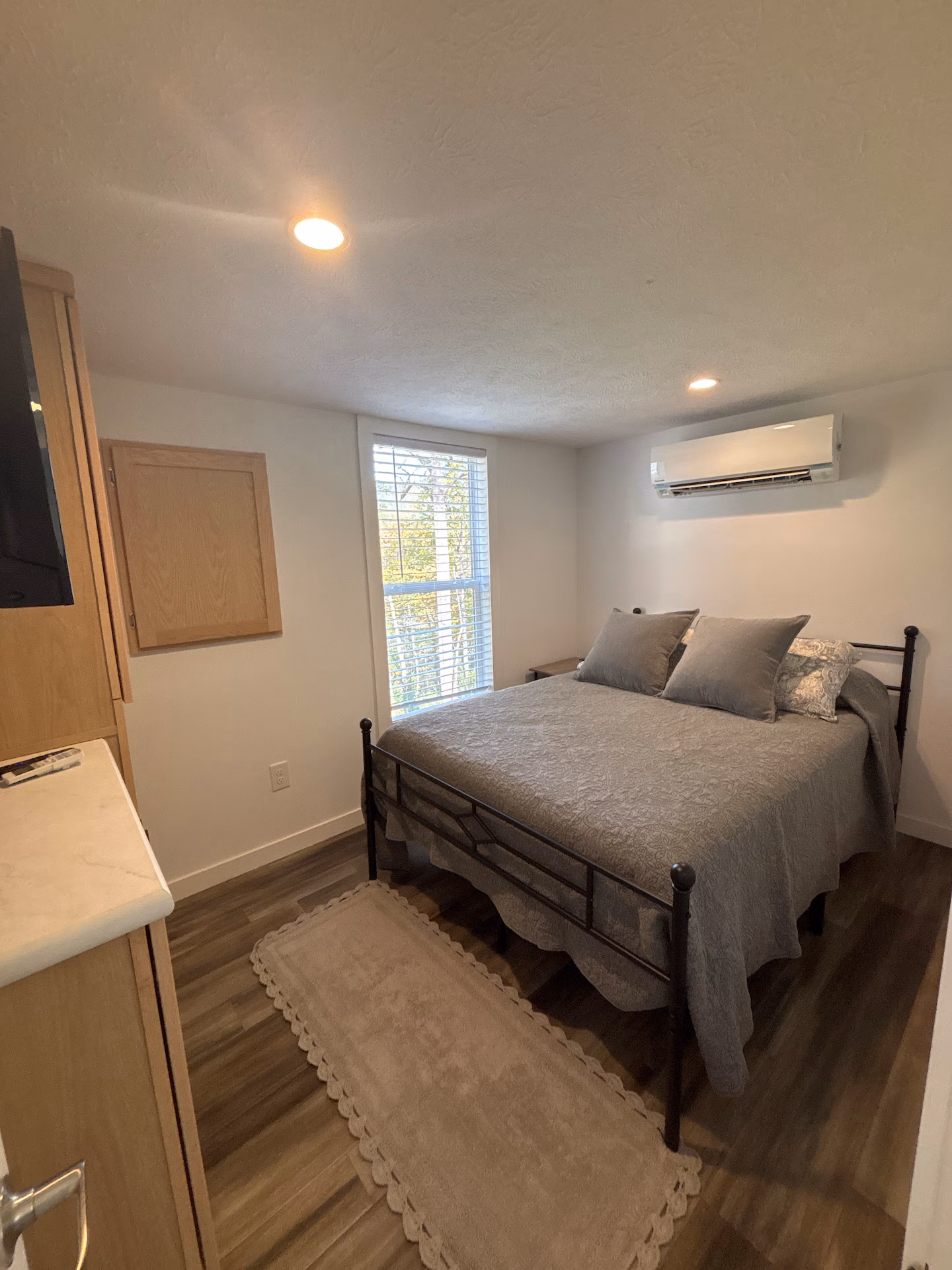 The bedroom offers a comfortable full bed with fresh linens, a flat-screen TV, and built-in storage. The bathroom includes a modern shower and plush towels for your stay.