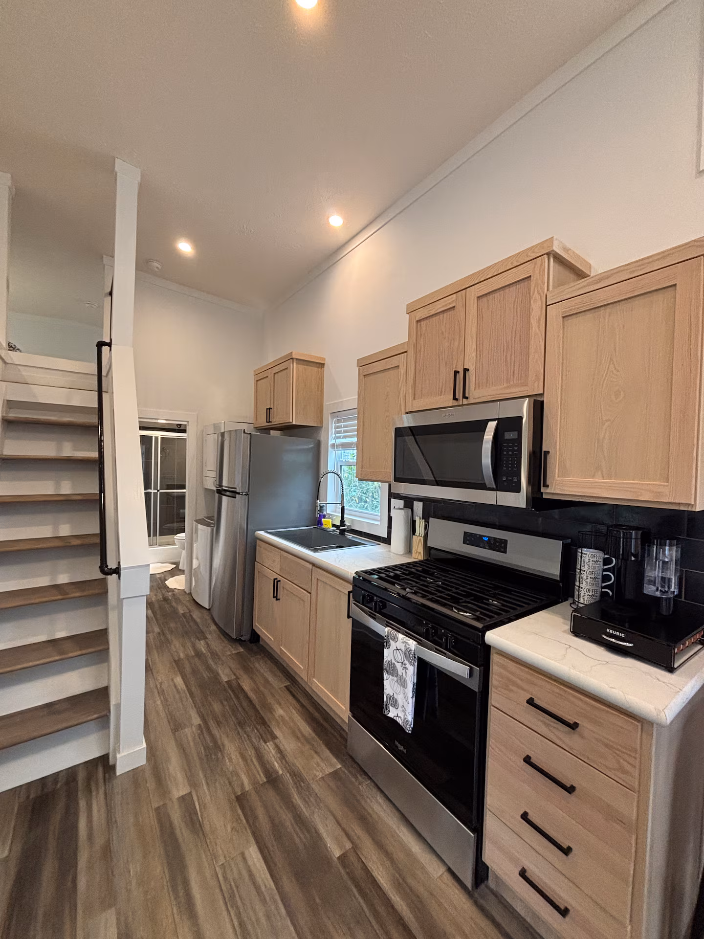 The kitchen comes fully equipped with stainless steel appliances, cookware, and bar seating, making it easy to enjoy home-cooked meals.