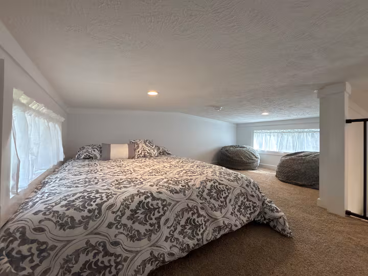 A cozy loft space (steps access) can be used as an additional sleeping area with two twin beds or a reading nook—great for families or extra guests.